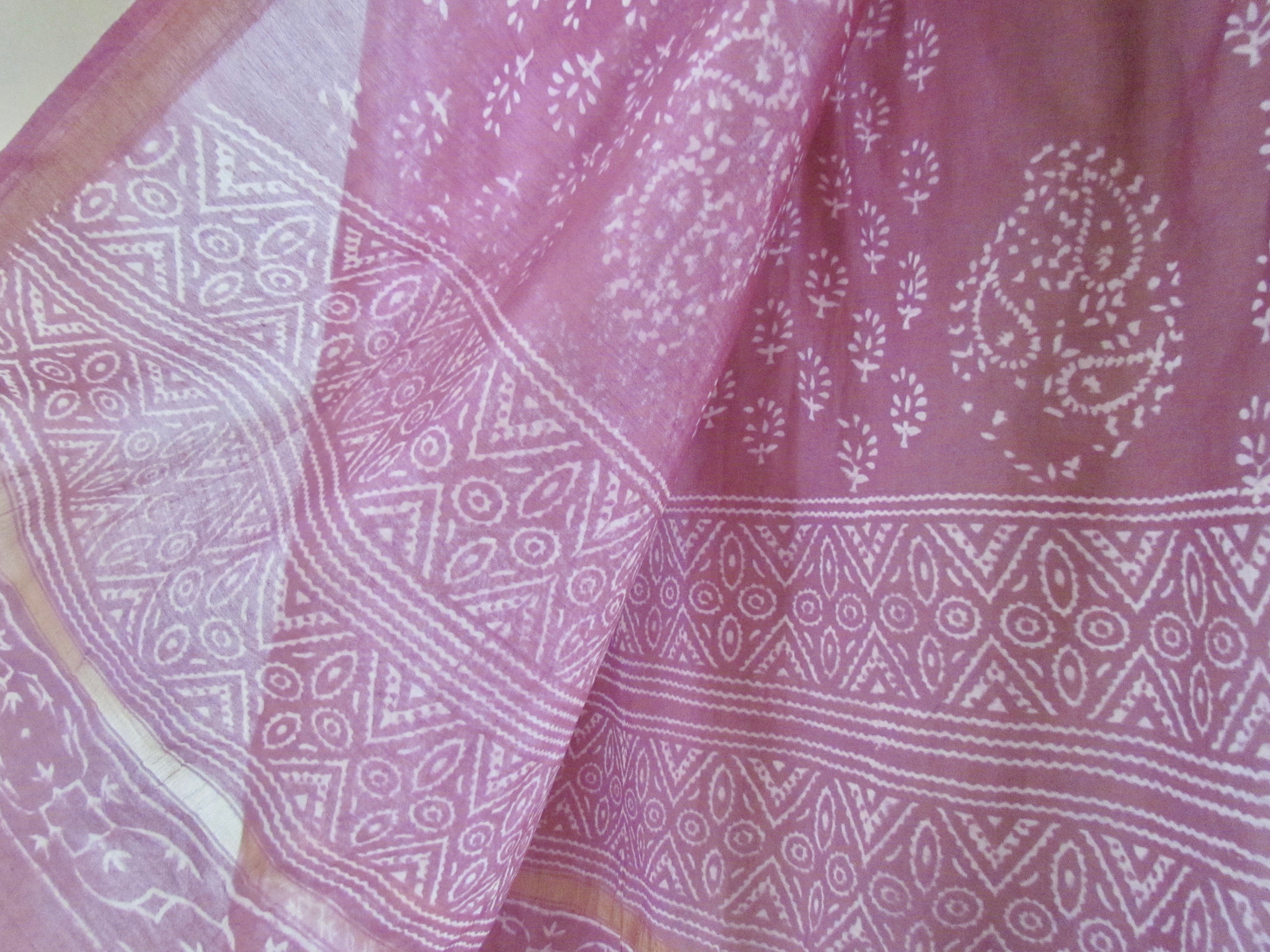 マディヤプラデシュの伝統織 チャンデリーシルク シルクとコットンで紡がれた繊細な糸で織られたショール 透け感に柔らかい光沢とハリがあるのが特徴です。 天然染料ではありませんが ピンクベージュに白抜きのハンドブロックプリントが施されていて 金糸が織り込まれたボーダーがアクセント。 春先軽やかに纏えば 気分が高まりそうです。